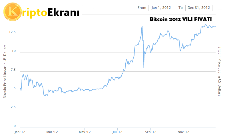 2012 yılında bir ara 15 Dolar seviyelerine çıksa da burada kalıcı olmayı başaramayan Bitcoin, yılı 13.5 Dolar ile kapatarak ilgi çekmeyi başardı. Bitcoin’in 2012 yılındaki ortalama değeri ise 8.46 Dolar’dı.